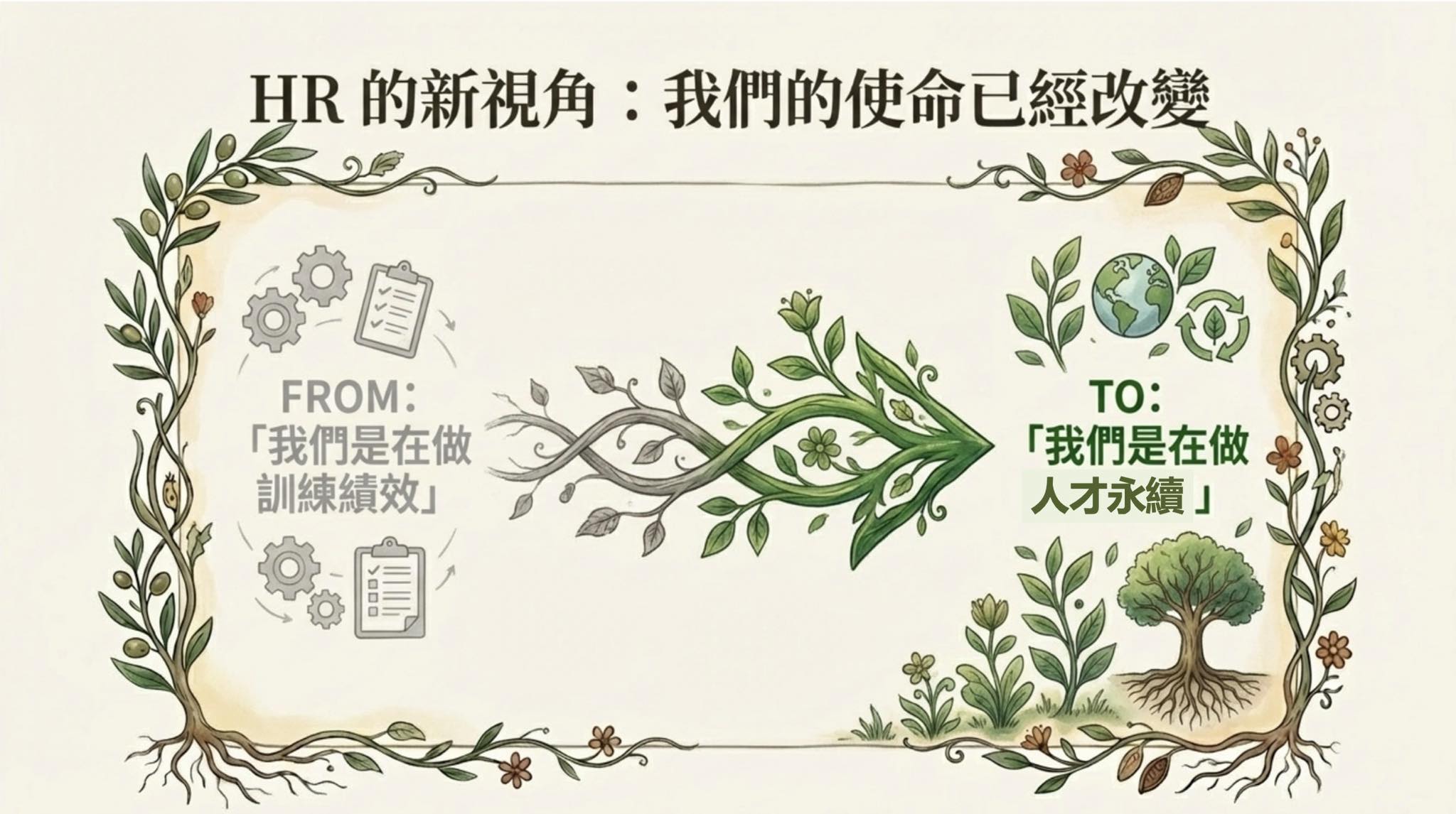 在AI與永續時代,HR如果只談訓練績效,會被視為支援單位; HR如果能談人才永續,會被視為戰略角色; HR如果能和永續長對話,HR 會進入治理核心